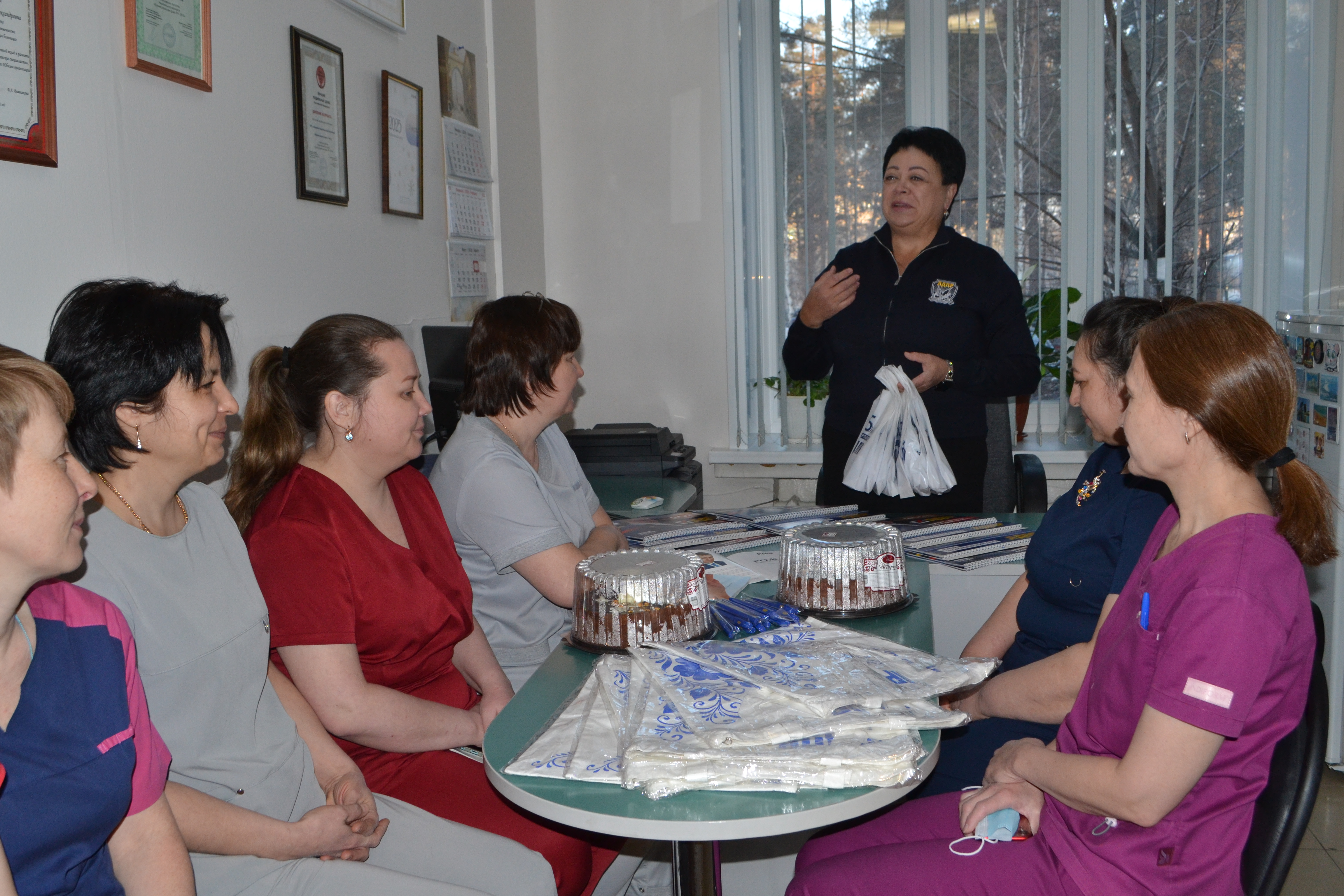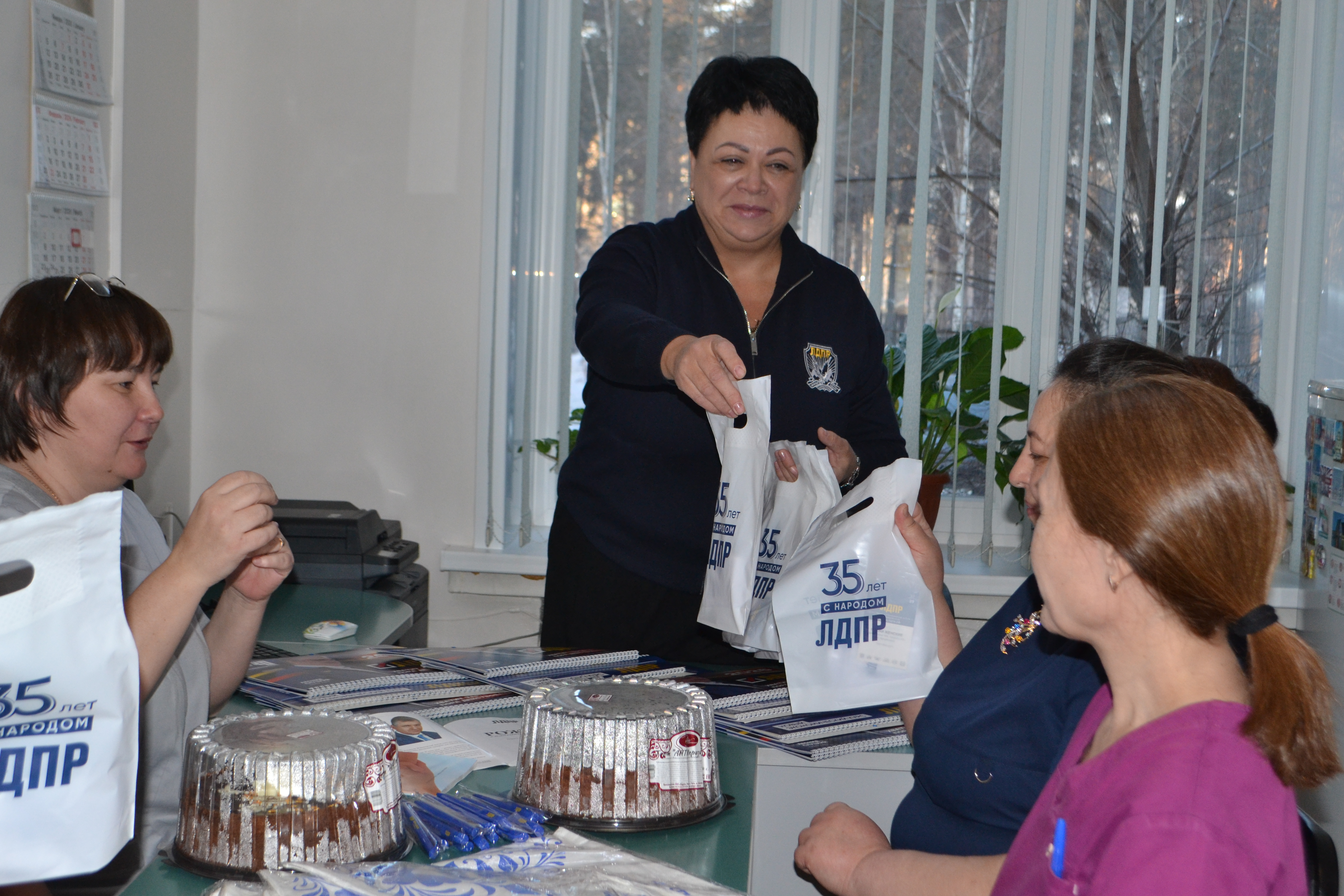 Светлана Илюхина поздравила персонал центра с Международным женским днем, вручила памятные подарки с партийной символикой, а также два торта, чтобы девушки отметили свой праздник.